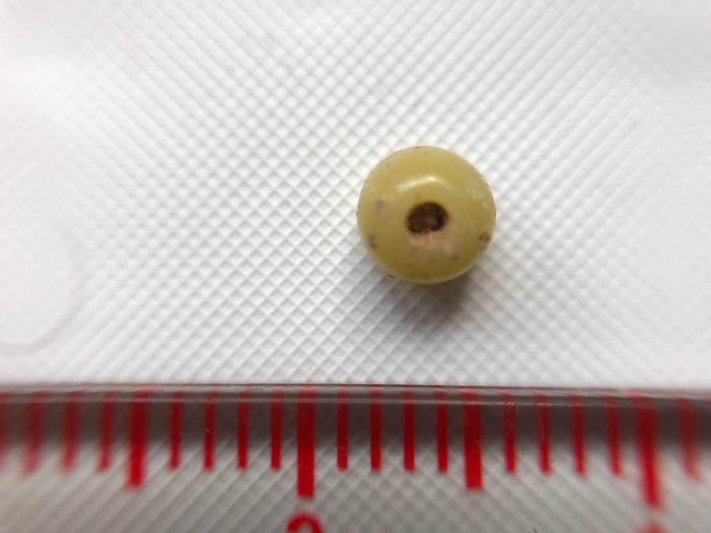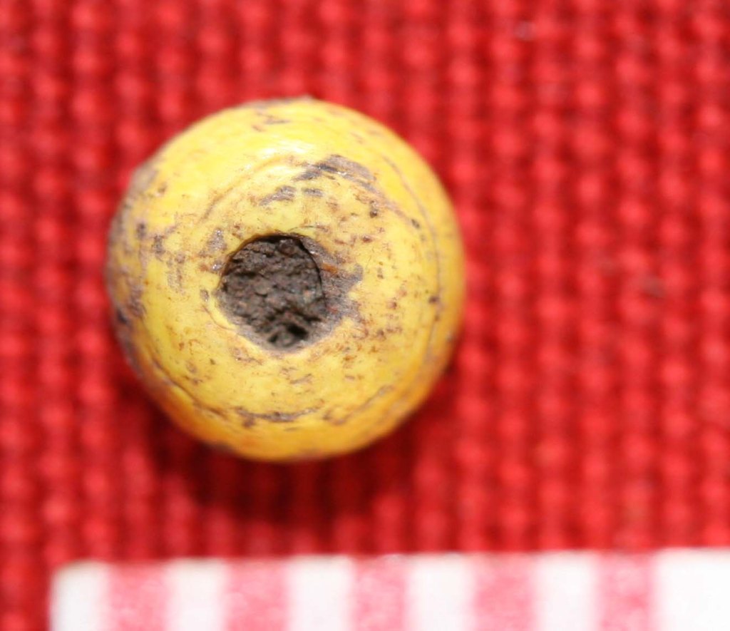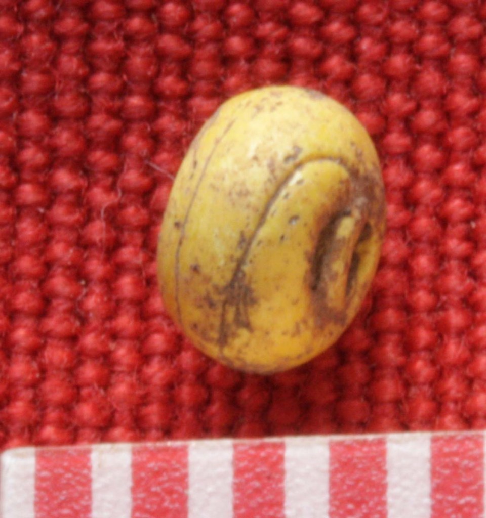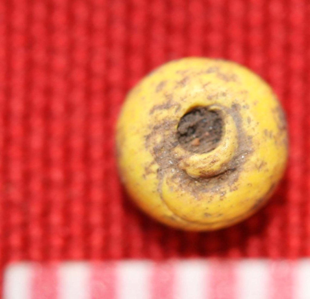 The scale above is in millimeters. The yellow bead in the lowest row of photographs clearly shows the winding technique that was used to make it, in common with many trade beads. The blue bead in the row above in contrast, may have been made by the technique of glass drawing, where a long thin tube of glass is drawn out and then cut into segments.