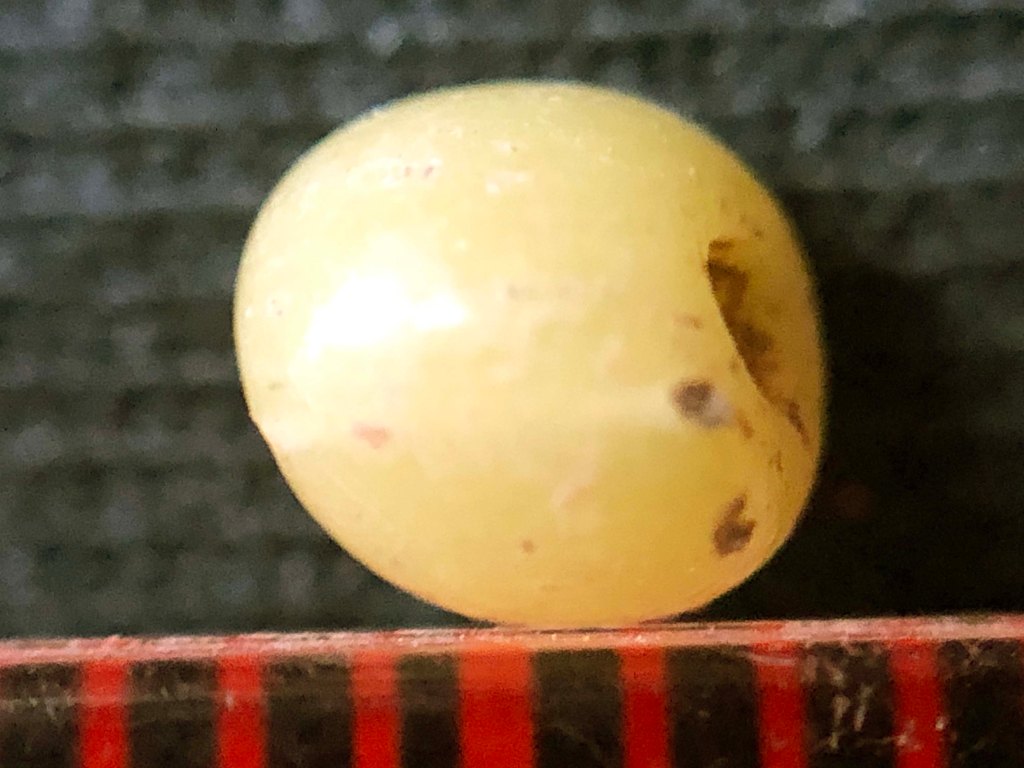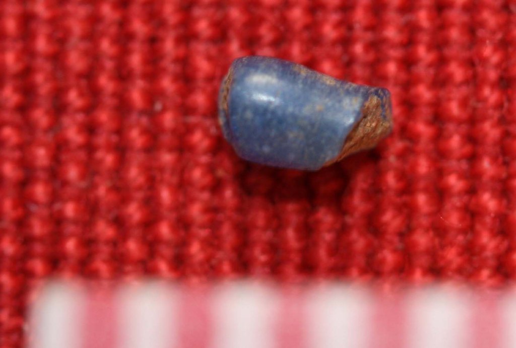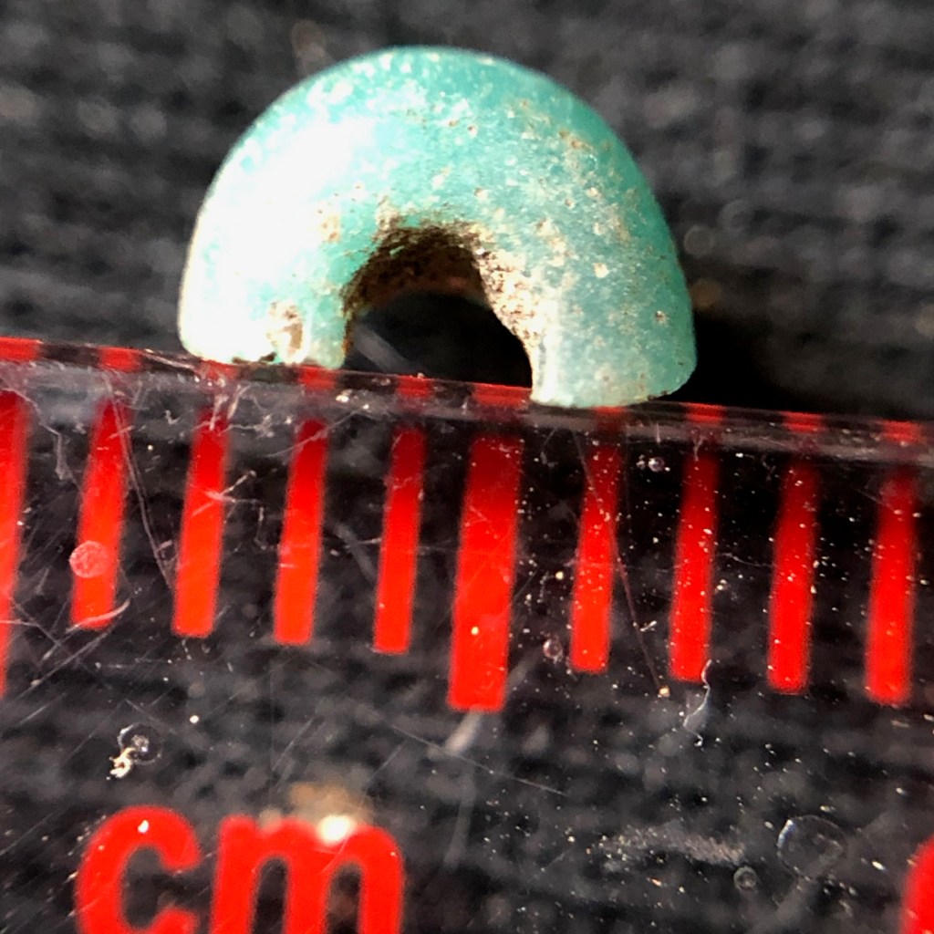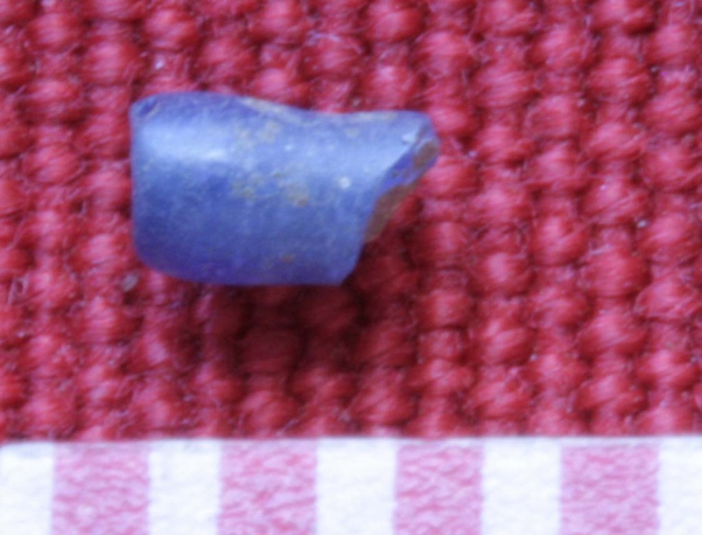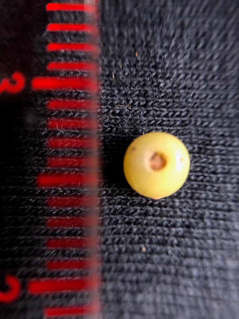 The scale above is in millimeters. The yellow bead in the lowest row of photographs clearly shows the winding technique that was used to make it, in common with many trade beads. The blue bead in the row above in contrast, may have been made by the technique of glass drawing, where a long thin tube of glass is drawn out and then cut into segments.