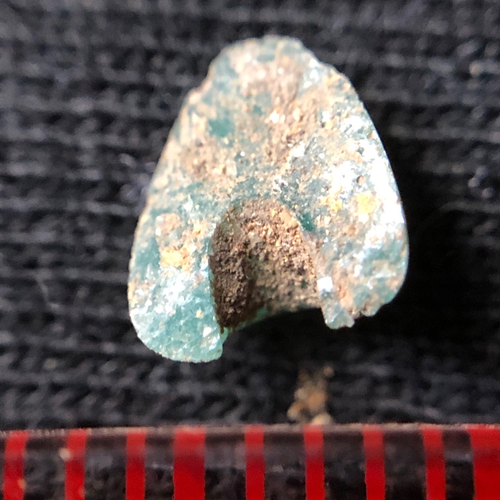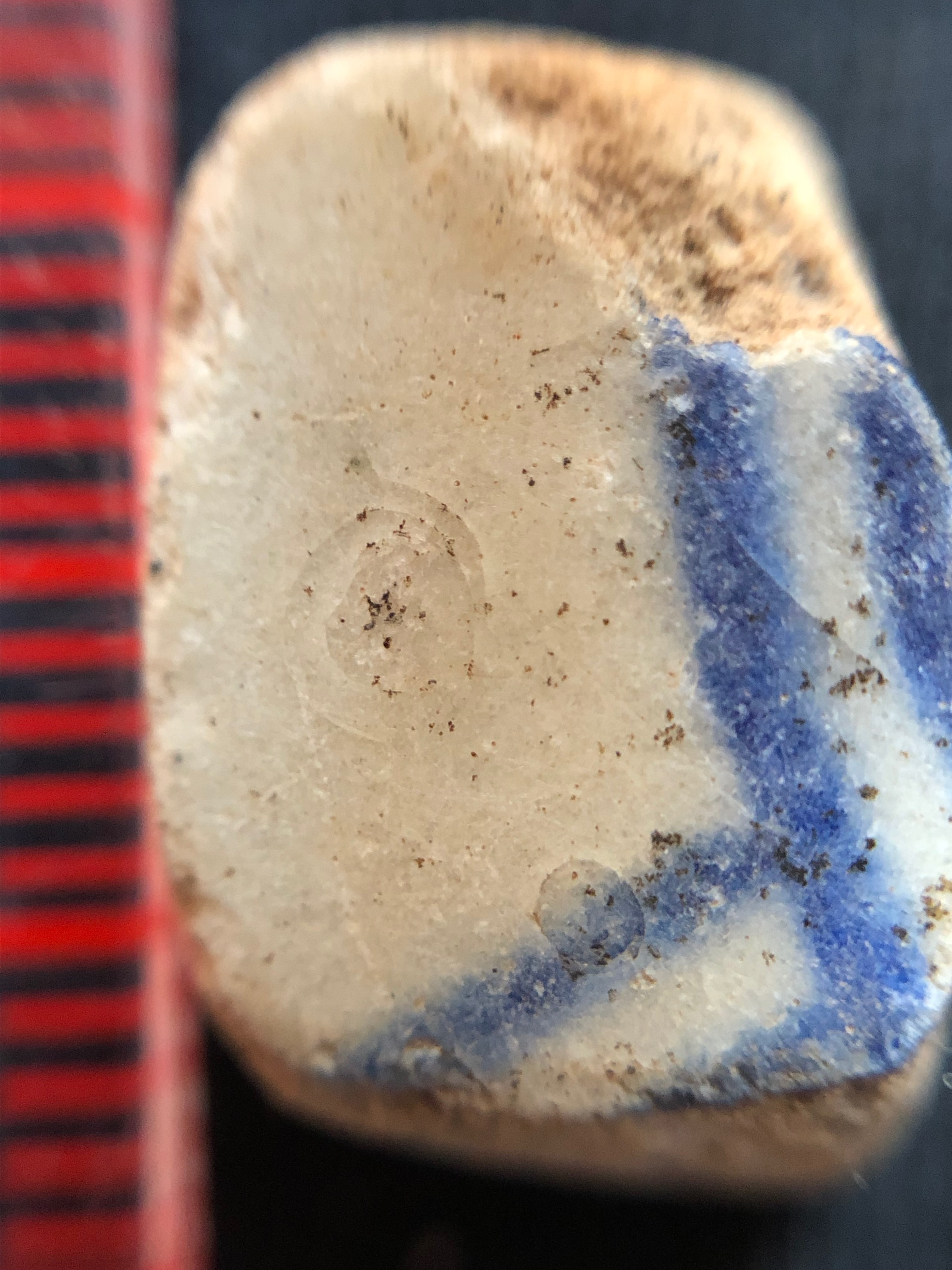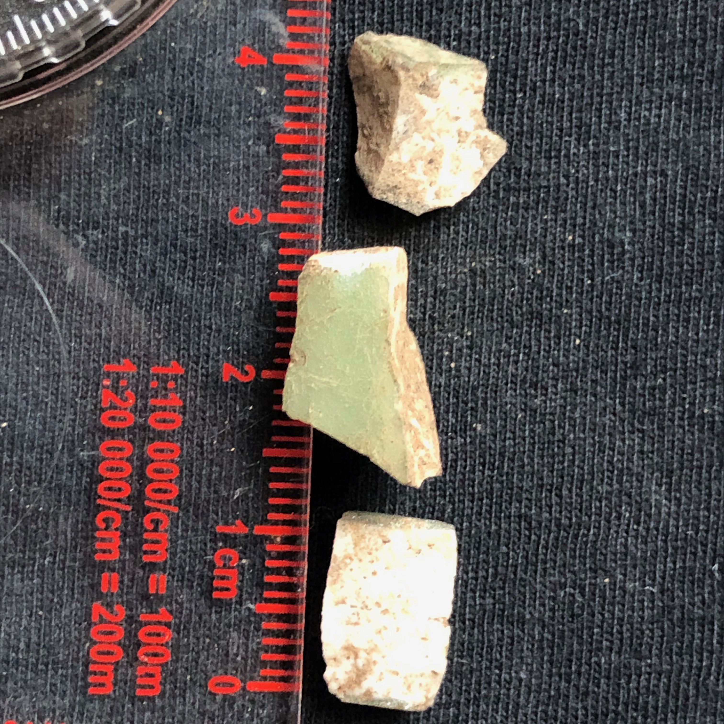 The imported pottery is mostly tiny fragments of porcellaneous green ware, commonly known as “celadon”, coming from China as part of the Indian Ocean trade. Dating broadly to the 15th century they are consistent with the radiocarbon dates we’ve obtained for the town. Our largest piece is a rim fragment with what looks like a firing error in the glaze on the rim (bottom right). The rim form of this piece is reminiscent of the ledge-lip bowls made in local earthenware pottery. The scale of the pieces on the red background is in millimeters. These fragments are tiny.