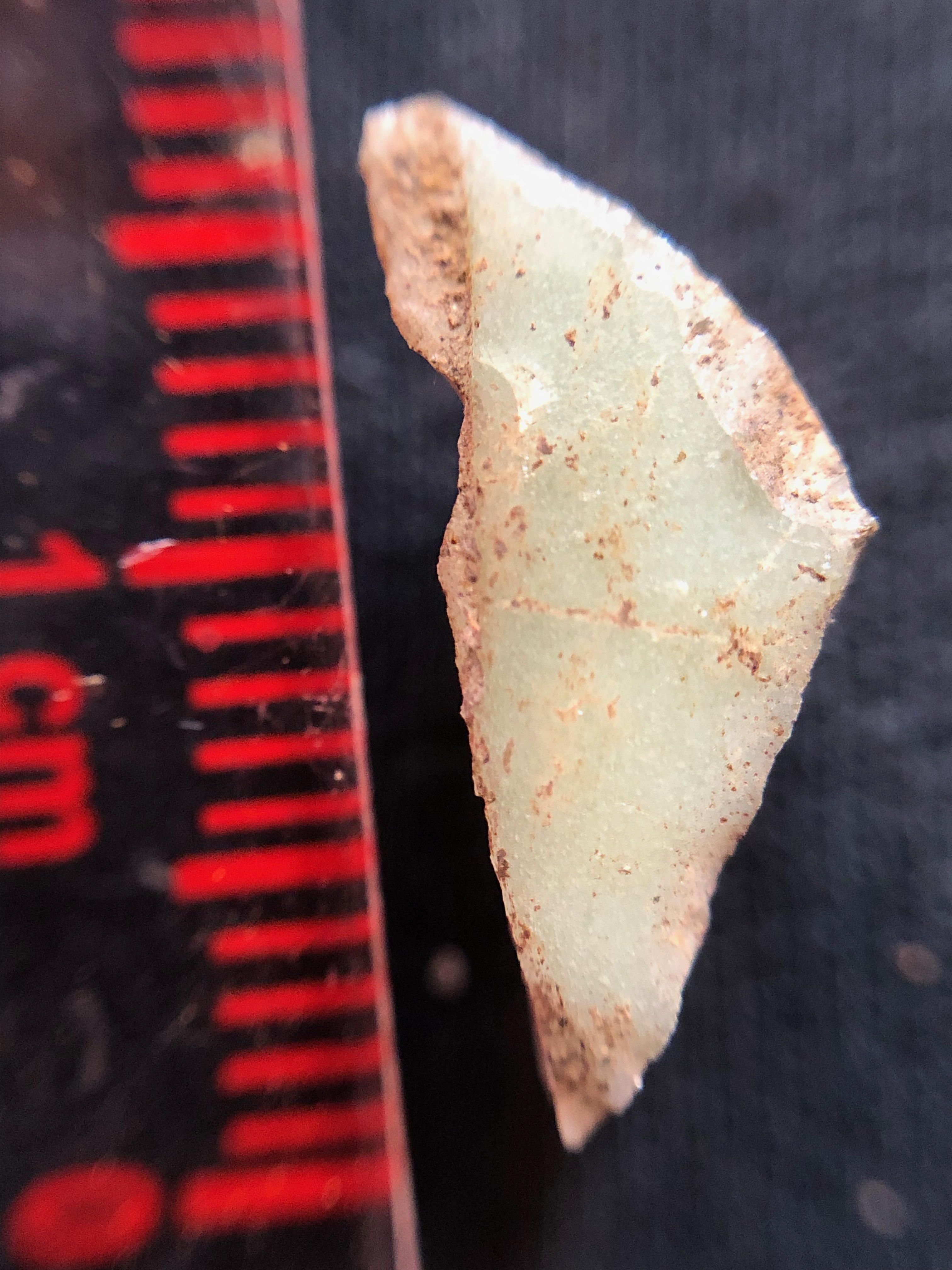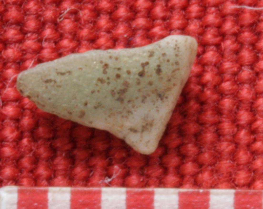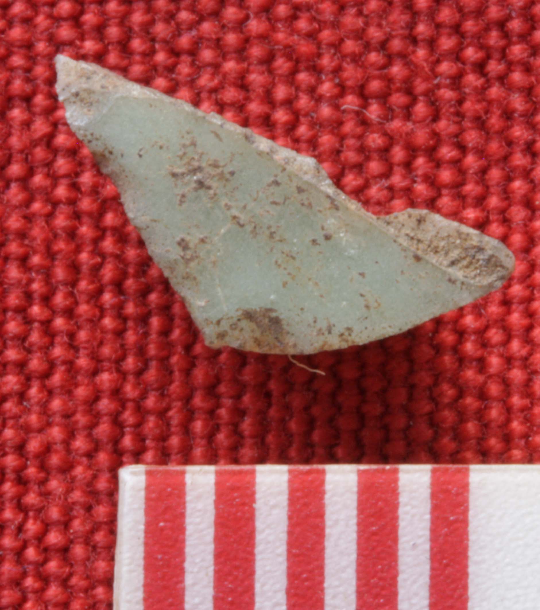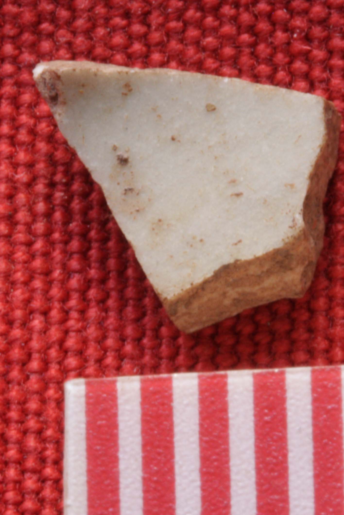 The imported pottery is mostly tiny fragments of porcellaneous green ware, commonly known as “celadon”, coming from China as part of the Indian Ocean trade. Dating broadly to the 15th century they are consistent with the radiocarbon dates we’ve obtained for the town. Our largest piece is a rim fragment with what looks like a firing error in the glaze on the rim (bottom right). The rim form of this piece is reminiscent of the ledge-lip bowls made in local earthenware pottery. The scale of the pieces on the red background is in millimeters. These fragments are tiny.